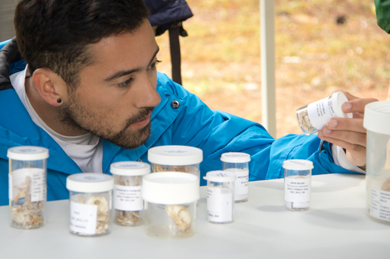 An attendee inspects specimen skeletons taken from