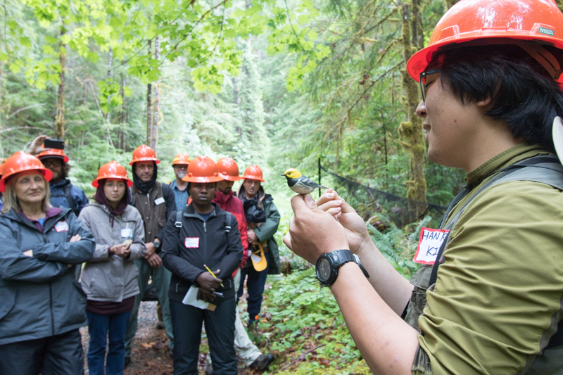 Hankyu Kim, with a model of a Hermit Warbler,
