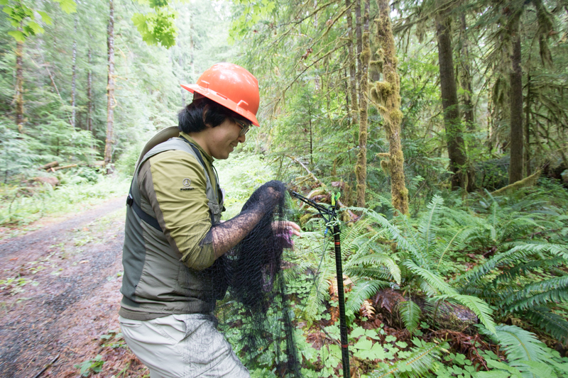 Hankyu Kim carefully puts away the mist net he